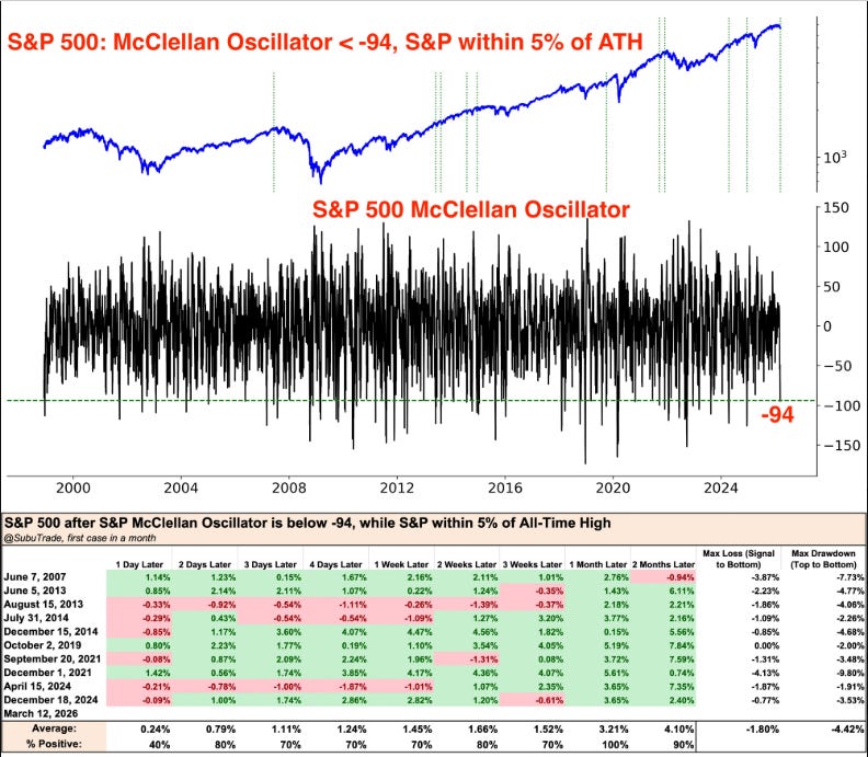 目前大盤已進入超賣狀態. 下面的表格是歷史上當McClellan Oscillator進入-94時, 接下來大盤的表現. 不過我們也知道一切還是要看油價.
