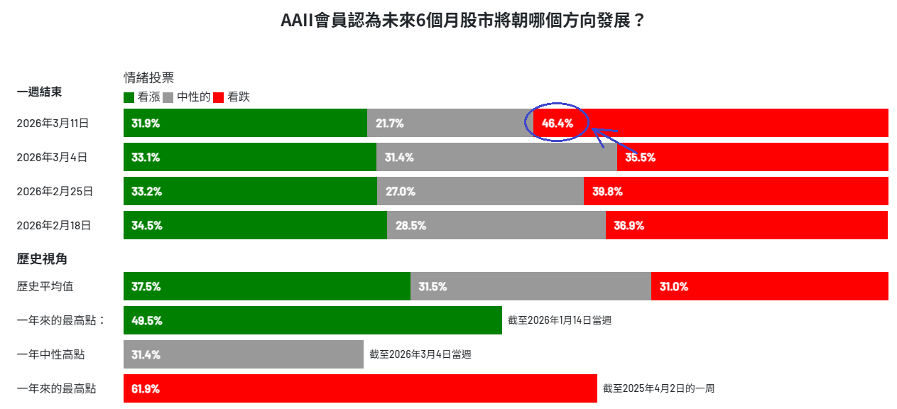 AAII 美國散戶投資人調查(這是contrarian indicator(反向指標)): 本周悲觀投資人占比數量大增. 這是好現象. 我希望能夠看到樂觀與悲觀投資人的差距再拉大.