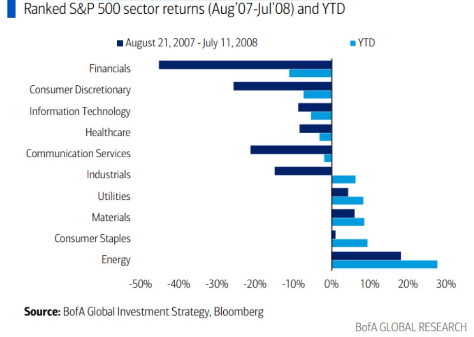 美銀美林策略師發現, 今年為止的類股走勢跟2007~2008年類似: