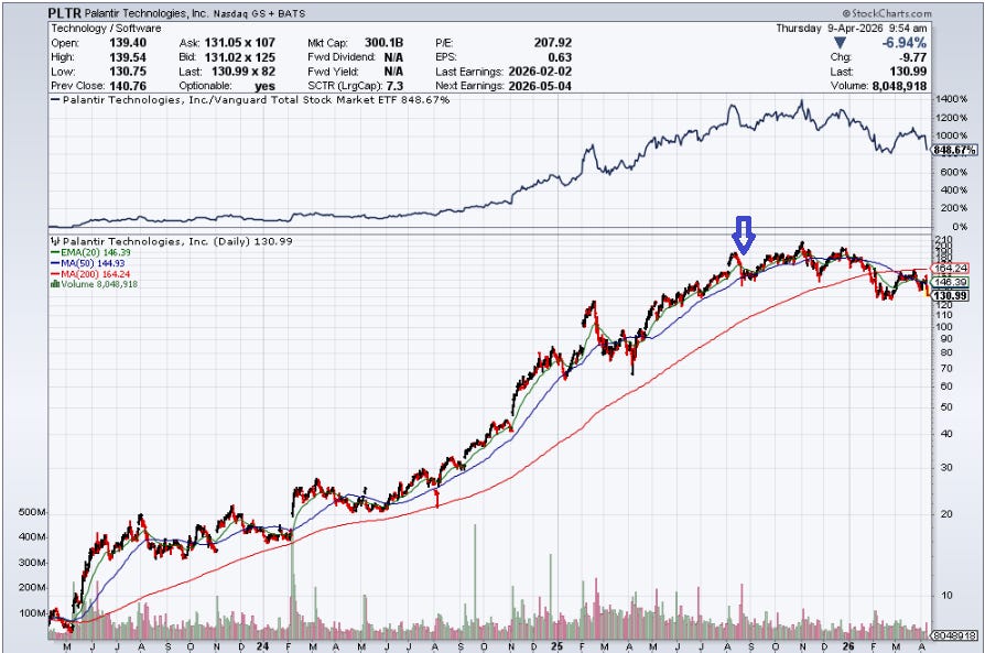 下圖中的藍色箭頭, 大概就是經濟學人發文的那個時候. 而當時PLTR開始走跌, 當然也有其他的因素(軟體類股整體走跌), 不過經濟學人那篇文章, 如今看來的確是個警訊.