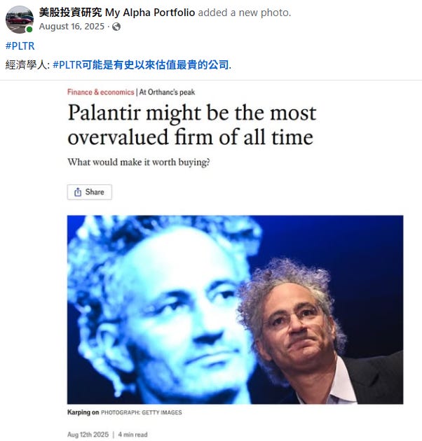 《經濟學人》在 2025 年 8 月 12 日發表了題為「Palantir 可能是史上最被高估的公司」(Palantir might be the most overvalued firm of all time)的文章。